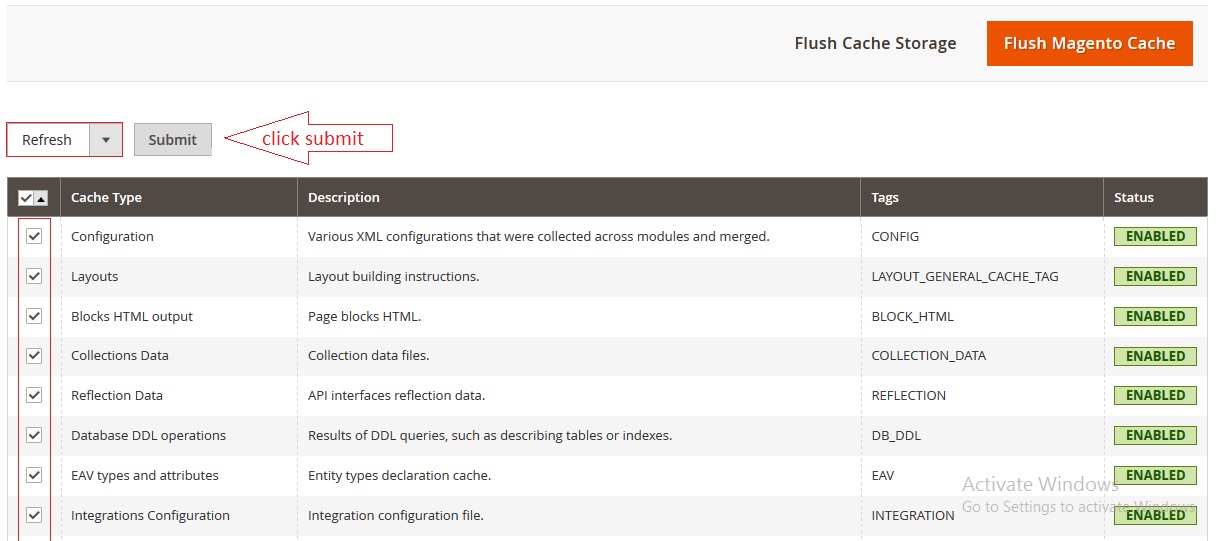 5. Continue go to SYSTEM >Cache Management >>Refresh >Submit > as image below: