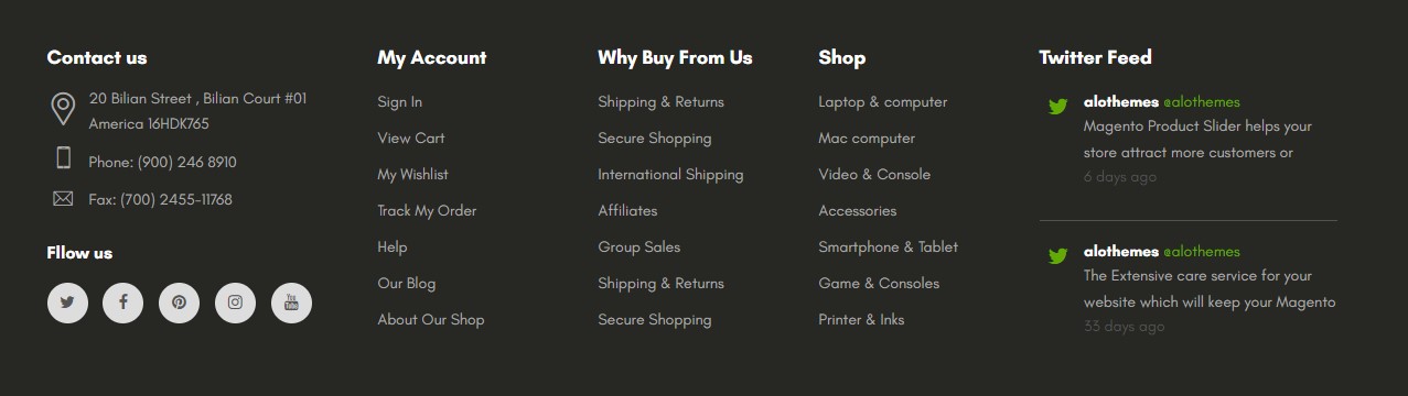 Go to Admin > Magiccart > ALO themes > Configuration > Social Profile > Twitter as image below