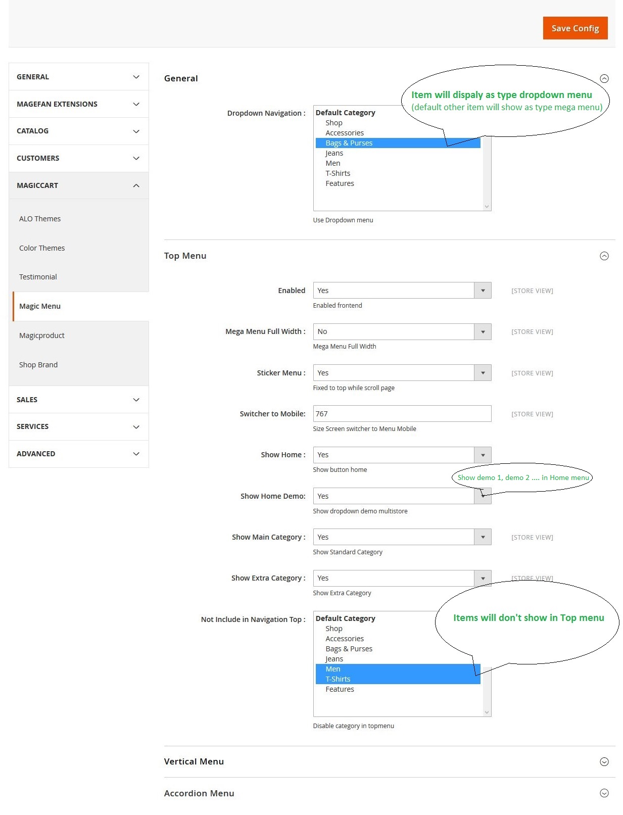 You must log in Admin > STORES > Configuration > Magic Menu to config. It might look like this: