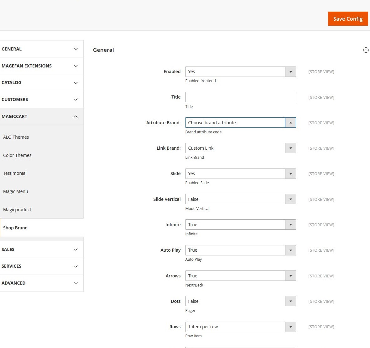 Admin > STORES > Configuration > Magiccart > Shop Brand It might look like this:
